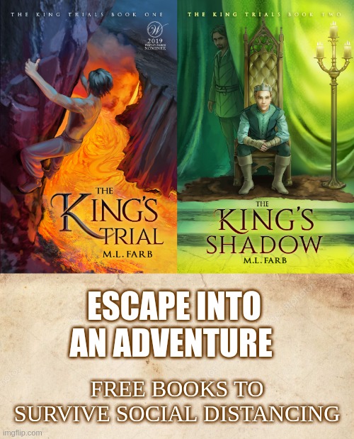In an effort to help fight boredom in this war, both The King’s Trial and The King’s Shadow are FREE to download from Booksprout through mid April.